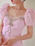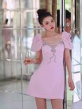 Đầm Hồng Viền Nơ Đá Cao Cấp