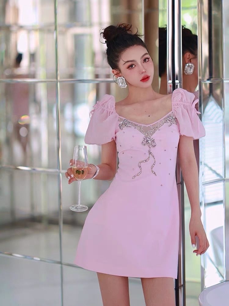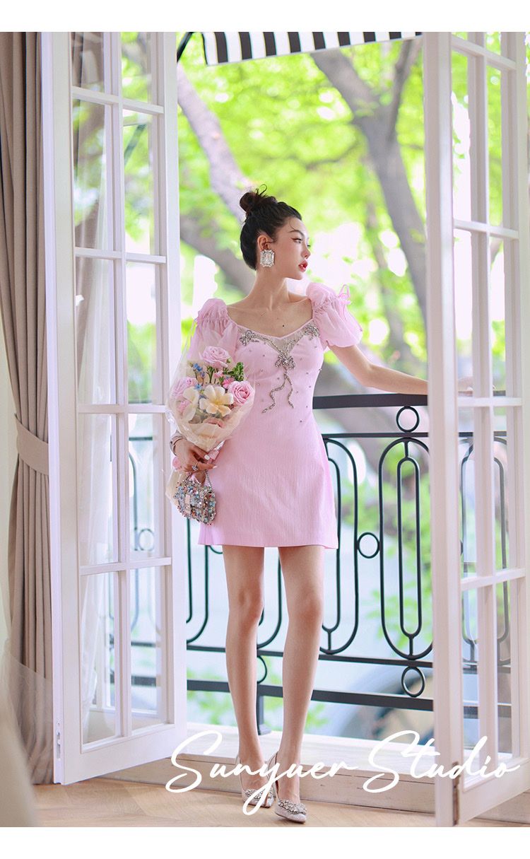 Đầm Hồng Viền Nơ Đá Cao Cấp – LULITA SHOP