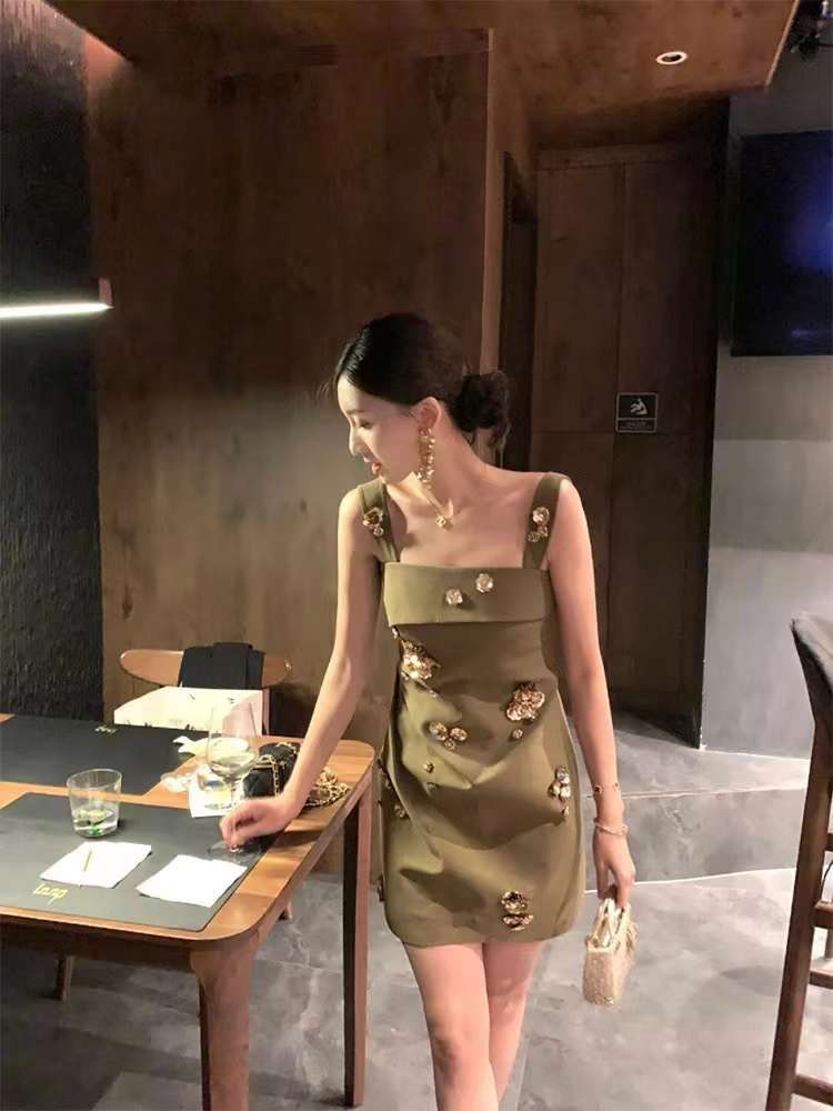 Đầm Xanh Rêu Đính Hoa Vàng – LULITA SHOP